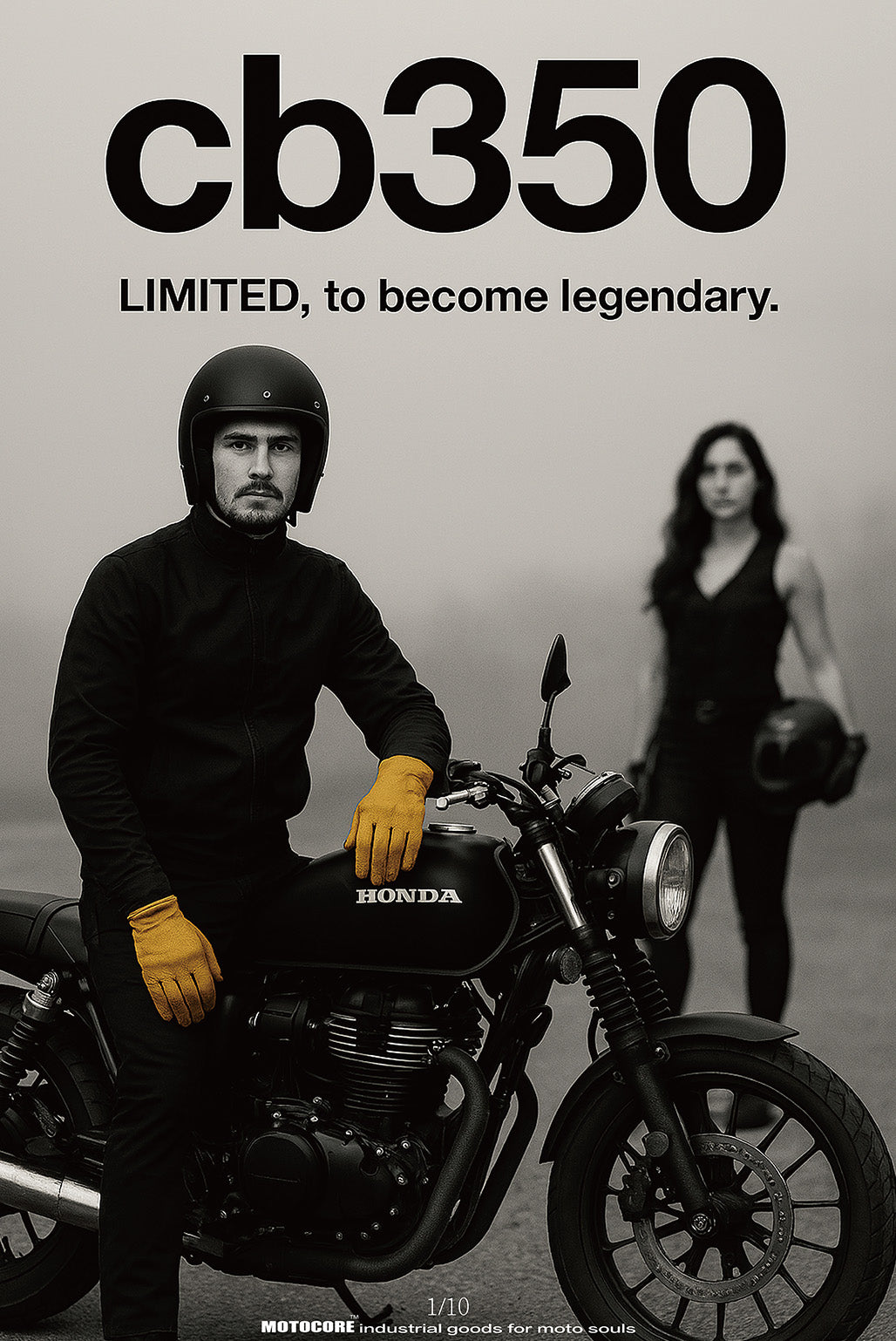 極簡工業風,結合黑白寫實攝影與 CB350 機械美學。