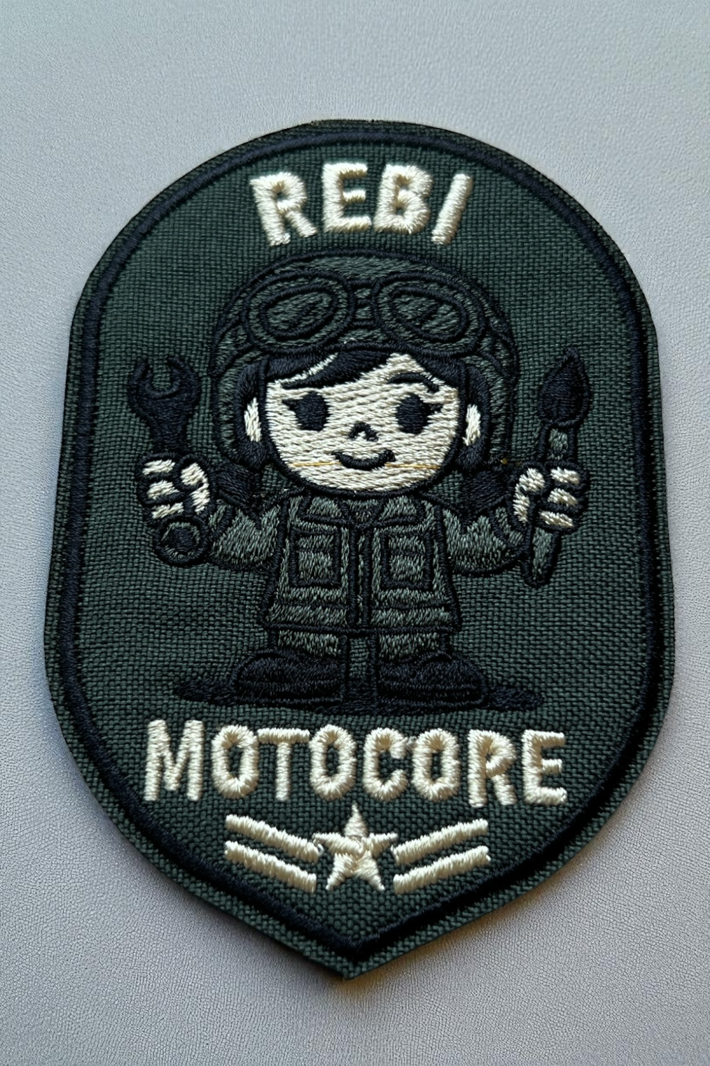 尺寸 9cm × 6.1cm|品牌代表角色 REBI,軍綠底 × 雙手工具 × 修車魂 MAX。